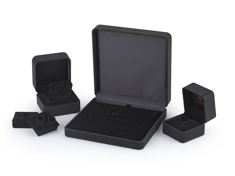 Csak logózva! Különleges mintájú hollófekete anyaggal bevont doboz elegáns külső dobozzal.