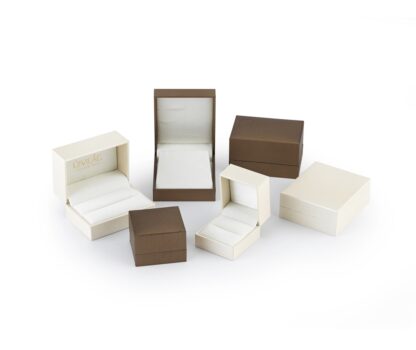 Bordázott papírral bevont nyíló doboz krém és barna színben. Külső tok azonos anyagból.